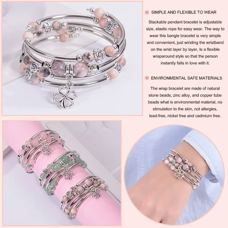 Elevate your style with this elegant multilayer bracelet featuring natural pink zebra stones in 6mm and 8mm beads. Handcrafted with precision, it showcases a delicate flower pendant that adds a refined touch. Designed for women who appreciate artisanal wrap jewelry, this piece combines natural beauty with sophisticated craftsmanship for a timeless accessory.