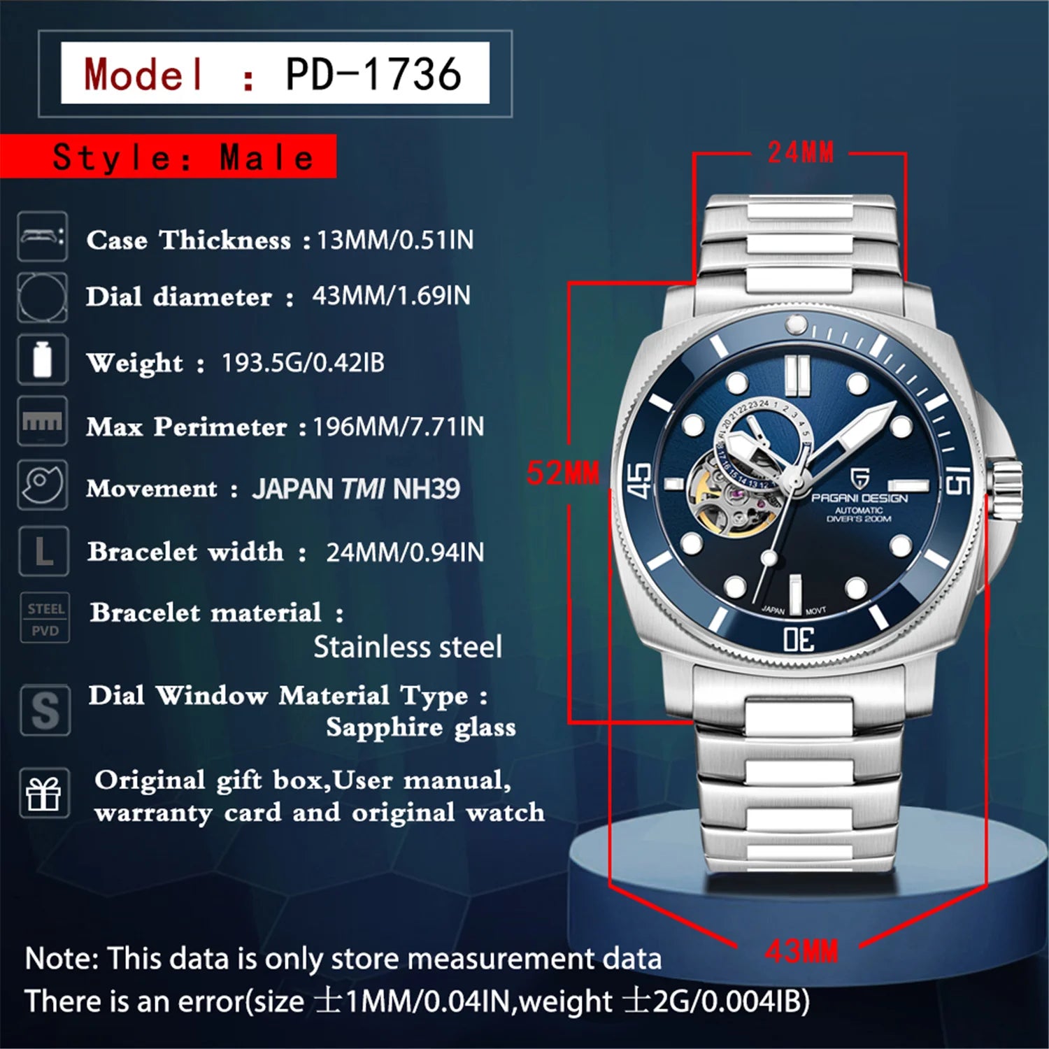 PAGANI DESIGN PD1736 Men's Automatic Mechanical Watch - 2024 New Sapphire Diving Watch, Stainless Steel