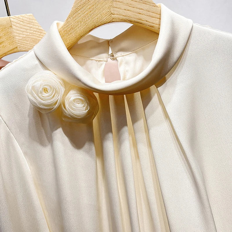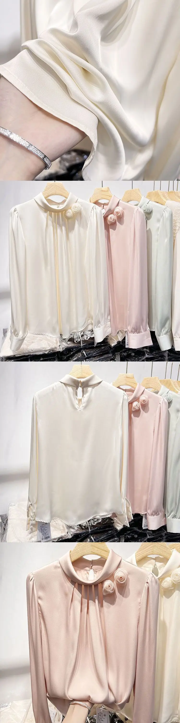 Indulge in the luxury of our Spring French Style Women's Shirt. With its graceful floral design and elegant standing collar, this minimalist top exudes sophistication. The long sleeves add a feminine touch, perfect for any occasion. Elevate your wardrobe with this exclusive piece.