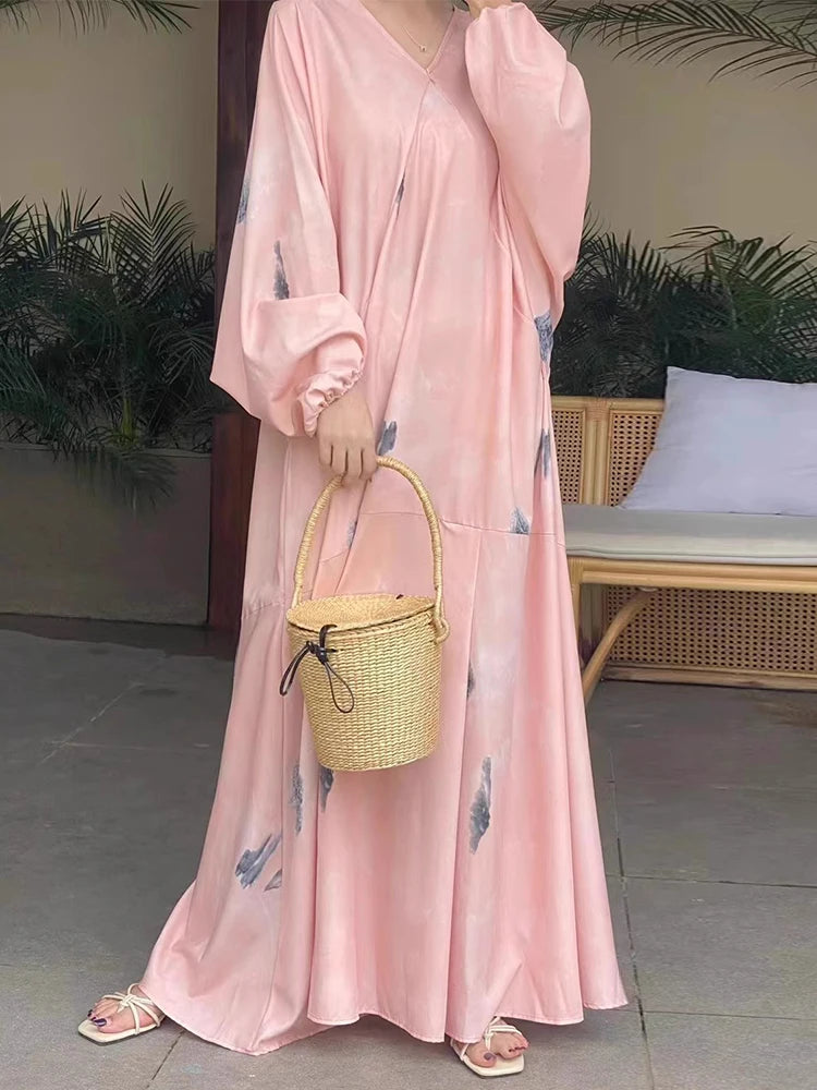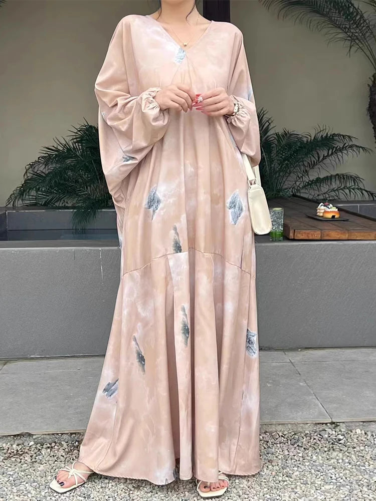 Summer Retro V-Neck Women's Dress – Ink Print, Vacation Style, Loose Fit, Batwing Sleeves