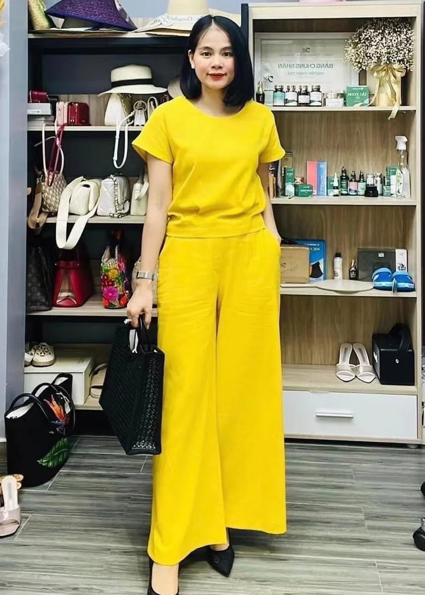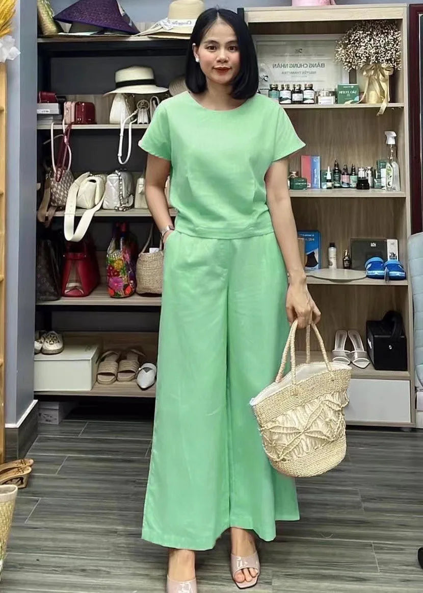 This two-piece set is perfect for summer activities. The loose fit and short-sleeved top provide comfort and freedom of movement, while the breathable trousers offer a cool and airy feel. Made of cotton linen for a casual and stylish look. Ideal for both sports and leisure.