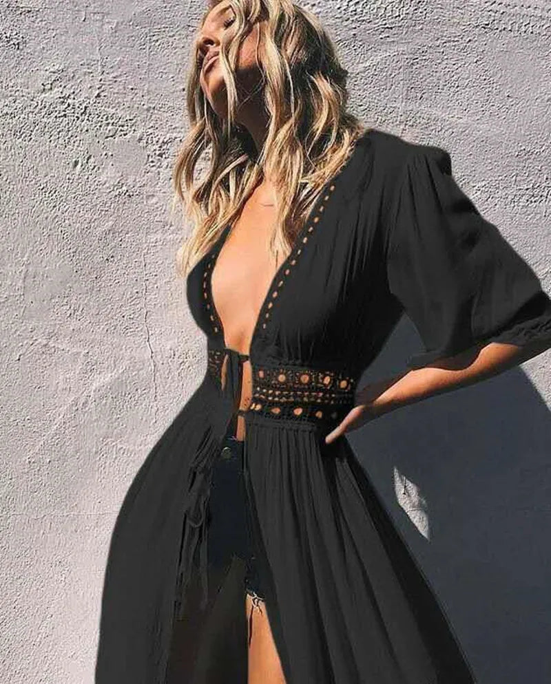 Stay stylish and protected from the sun in our Women Beach Dress. Made with delicate lace, this beachwear adds a touch of elegance to your swimwear. Perfect for covering up while lounging on the beach or by the pool. Enjoy the sun without worrying about harmful rays.