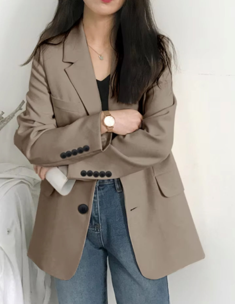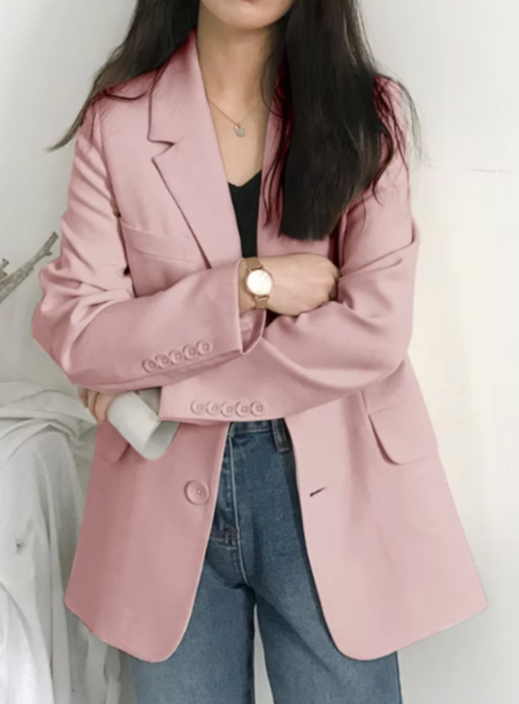 This versatile blazer is the perfect addition to any professional wardrobe. With its loose fit, it provides both comfort and style, making it suitable for both formal and casual settings. Complete with pockets, it offers convenience and functionality for the busy woman on-the-go. Elevate your office attire with this must-have piece.